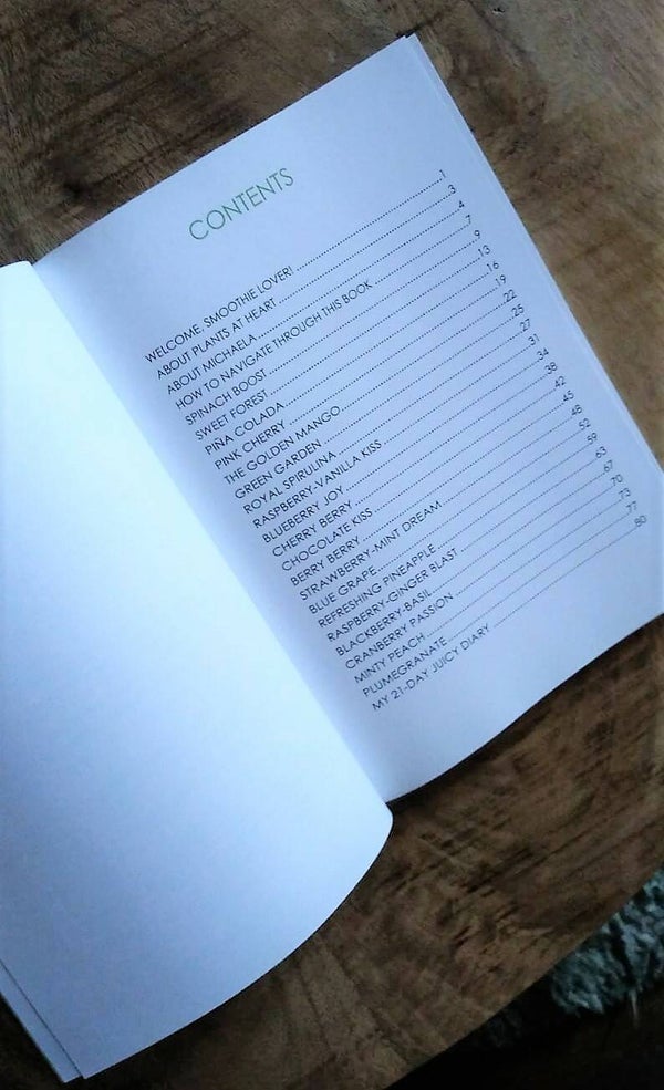 his unique guide contains smoothie recipes together with their own nutritional profiles, illustrating the macro and micronutrient composition. The energy values of every smoothie are also included to guide your daily smoothie choices based on your current activity level. The Juicy Smoothie Guide is finalized by a brief personal diary for mindfulness, self-awareness, reflection and personal growth.